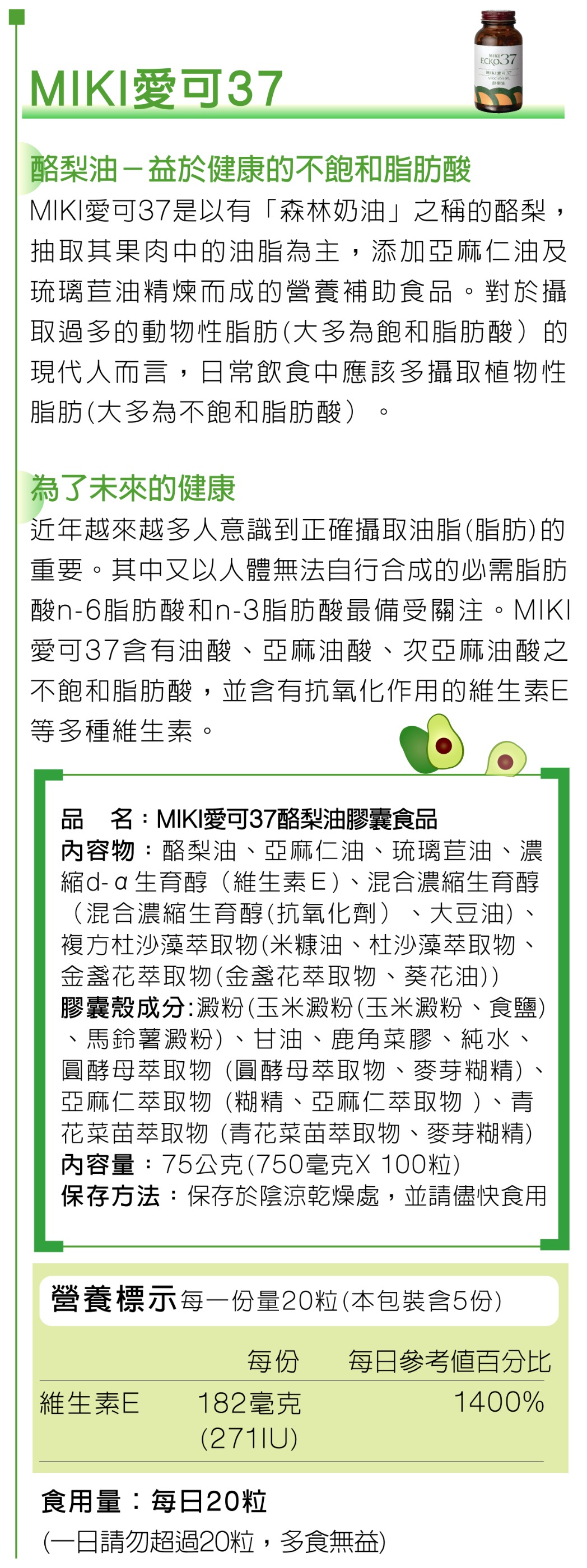 日本MIKI愛可37是抽取酪梨果肉中油脂精煉,添加琉璃苣油、亞麻仁油精練而成,膠囊中添加亞麻仁萃取物、青花菜苗萃取物及酵母萃取物。MIKI愛可37除了含有容易欠缺的不飽和脂肪酸外,也含有抗氧化功能的維生素E,幫助全家人達到營養均衡的飲食。